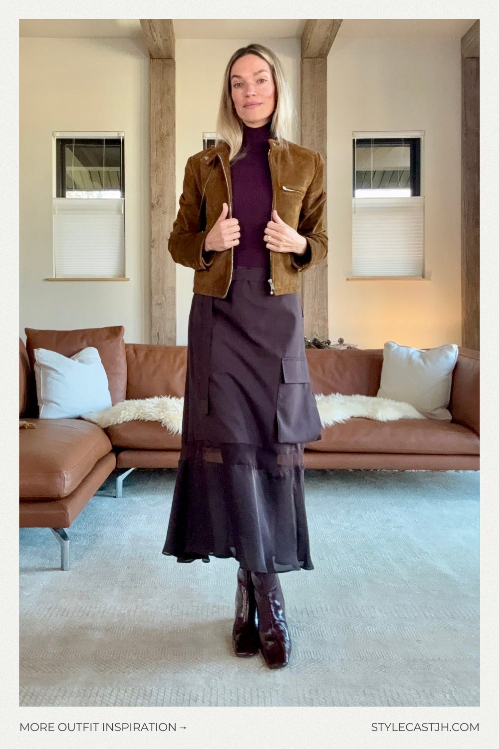 When the sun is out at altitude, even in the temps are low, it will always feel warmer. Lean into the burgundy trend with a monochromatic look. Start with a midi skirt (you can go for a cargo style like I did or a slip one), add a knit on top and a knee-high boot in a similar hue. Try a suede jacket as your ‘indoor’ layer for extra warmth and add an oversized wool coat for when you’re out and about town. Shop the look here.